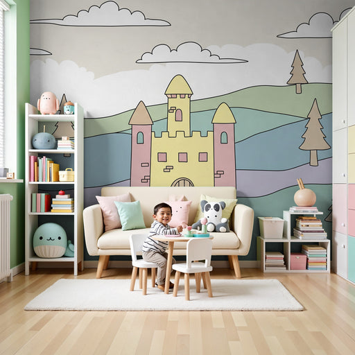 KidsWallPrzekształć pokój swojego dziecka w prawdziwe magiczne królestwo z tą tapetą dla dzieci, przedstawiającą uroczą, kolorową zamek otoczoną eleganckim...