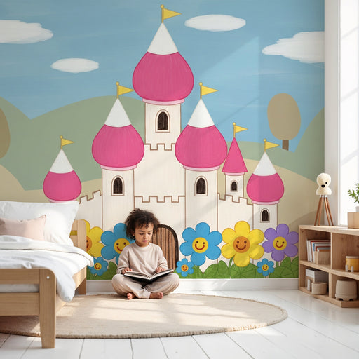 KidsWallPrzekształć pokój dziecka w zaczarowane królestwo za pomocą tego tapety dla dzieci przedstawiającej piękny różowy zamek otoczony radosnymi kwiatami...