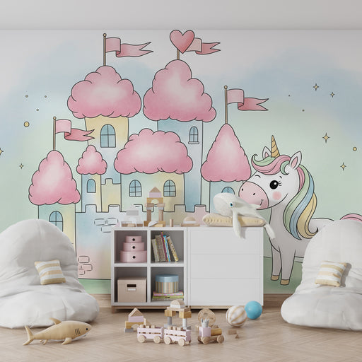 KidsWallPrzekształć pokój swojego dziecka w prawdziwą bajkę za pomocą tego tapety dla dzieci, przedstawiającej piękny zamek otoczony różowymi chmurami i ur...