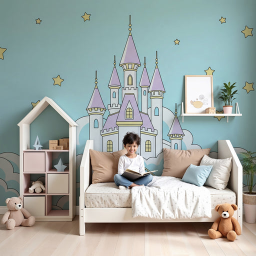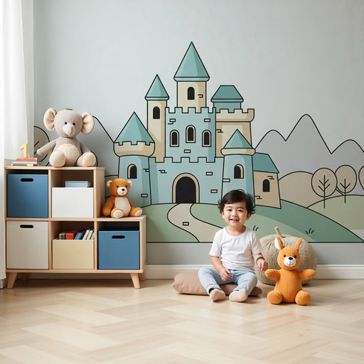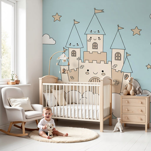 KidsWallPrzekształć pokój swojego dziecka w magiczne królestwo za pomocą tego tapety dla dzieci. Ten uroczy zamek w delikatnych odcieniach niebieskiego maj...