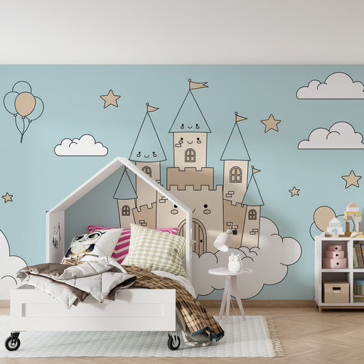 KidsWallPrzekształć pokój swojego dziecka w prawdziwe magiczne królestwo za pomocą tego tapety dla dzieci, przedstawiającej radosny zamek unoszący się wśró...