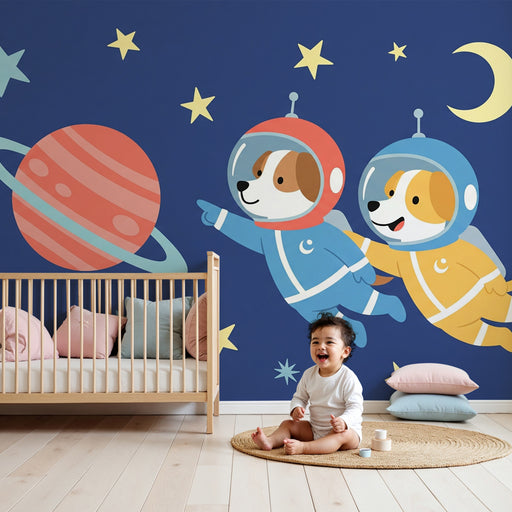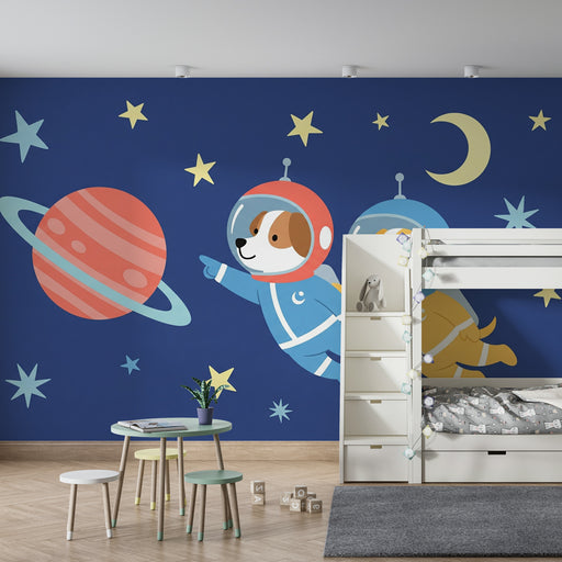 KidsWallWyrusz w kosmiczną przygodę w pokoju twojego dziecka z tą uroczą tapetą, na której dwie urocze psy w kombinezonach astronautów dryfują przez gwiezd...