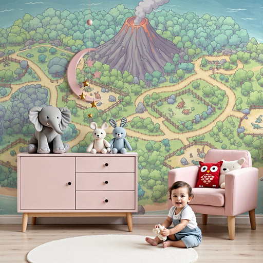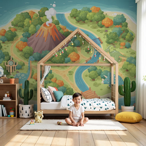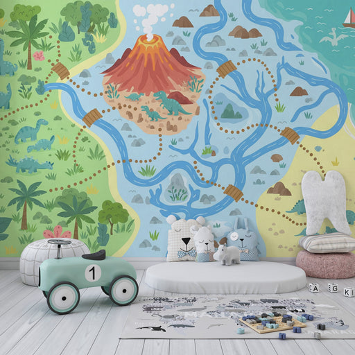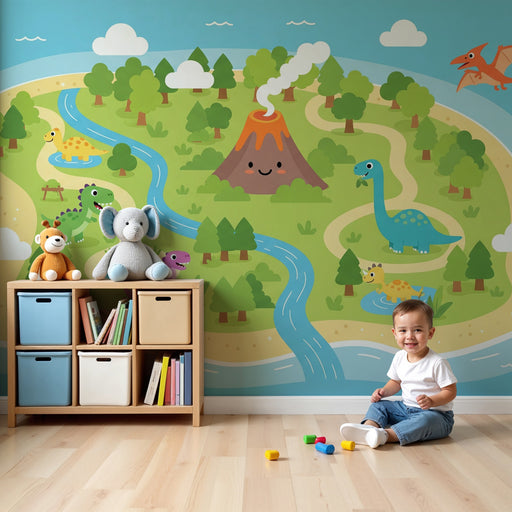 KidsWallPrzeżyj fascynujący świat z tą tapetą dla dzieci, przedstawiającą mapę wyspy pełnej przygód z dinozaurami. W centrum wybuchający wulkan sprawia, że...