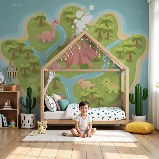 KidsWallPrzekształć pokój swojego dziecka w miejsce ekscytujących przygód za pomocą tego tapety dla dzieci, przedstawiającej wyspę zamieszkałą przez dinoza...