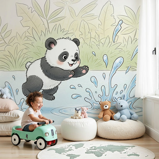 KidsWallDodaj odrobinę radości i przygody do pokoju dziecka za pomocą tej tapety dla dzieci, przedstawiającej uroczego młodego pandę bawiącego się w wodzie...