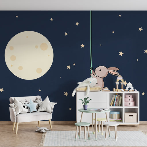 KidsWallZabierz swoje dziecko w magiczną podróż z tą tapetą dla dzieci przedstawiającą uroczego królika wspinającego się ku księżycowi. Na tle gwiaździstym...
