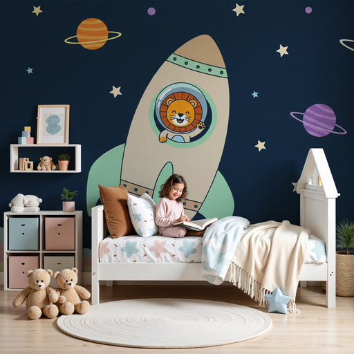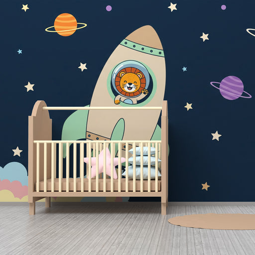 KidsWallWyrusz w kosmiczną przygodę do pokoju swojego dziecka z tą zabawną tapetą przedstawiającą uśmiechniętego lwa w rakiecie. W otoczeniu kolorowych pla...