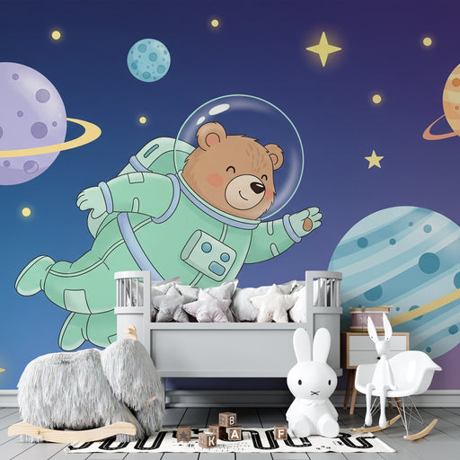 KidsWallWyrusz w kosmiczną przygodę z tą tapetą dla dzieci, przedstawiającą uroczego pandę w kombinezonie kosmicznym, dryfującego między kolorowymi gwiazda...