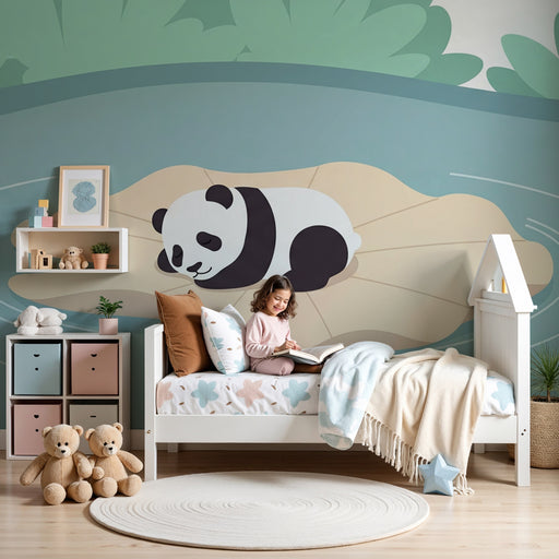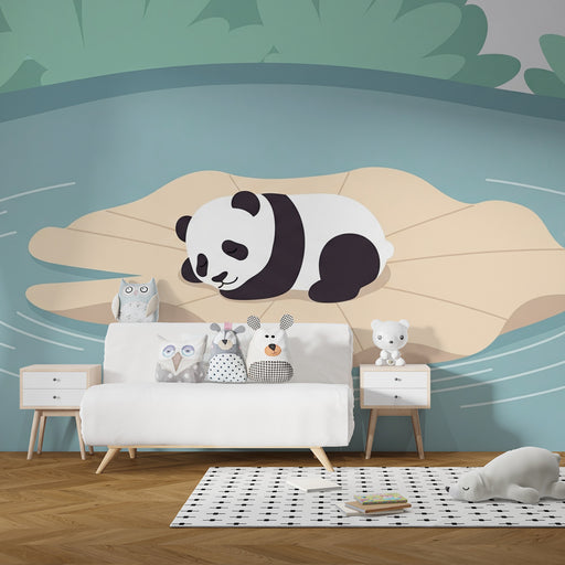 KidsWallPrzyozdób pokój swojego dziecka tym tapetą dla dzieci przedstawiającą uroczego pandę odpoczywającego na liściu w spokojnym otoczeniu. Spokojna scen...