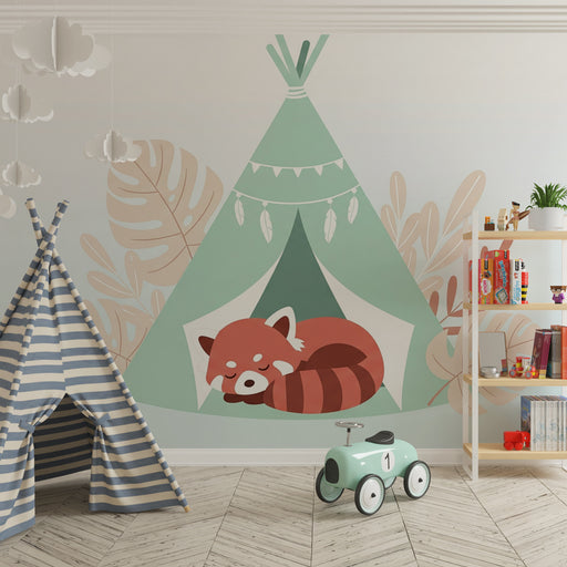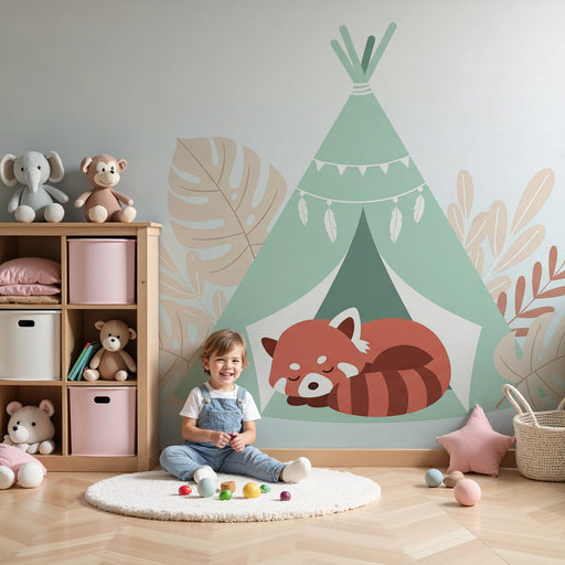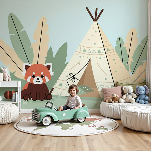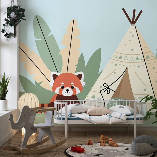 KidsWallPrzemień przestrzeń w pokoju dziecka tym tapetą dla dzieci z uroczymi motywami rudego pandy i tipi. W sercu zabawnej sceny uroczy rudy panda spokoj...