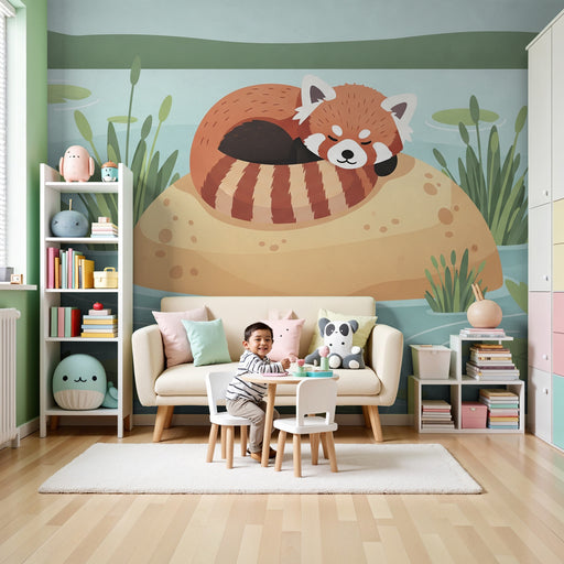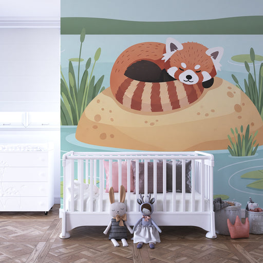 KidsWallPrzekształć pokój swojego dziecka w prawdziwy azyl spokoju dzięki temu tapetowi dla dzieci, przedstawiającemu uroczego, śpiącego rudego pandę na ka...