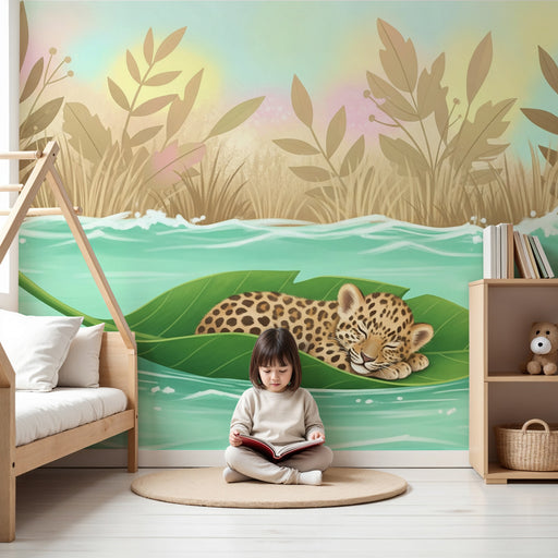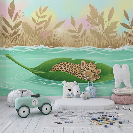 KidsWallPrzekształć pokój swojego dziecka za pomocą tej tapety dla dzieci, przedstawiającej uroczego zaspanego lamparta na dużym dryfującym liściu. Z delik...