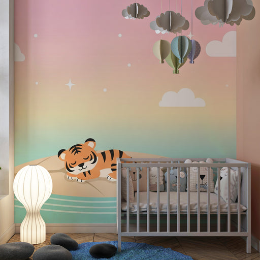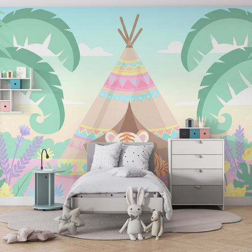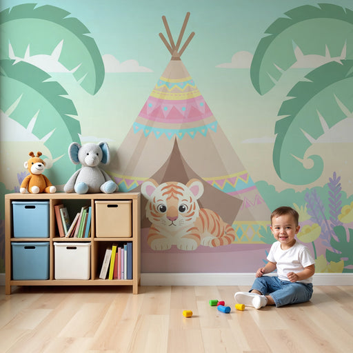 KidsWallPrzekształć pokój swojego dziecka w magiczny świat z tą tapetą dla dzieci, na której widnieje uroczy mały tygrys odpoczywający przed kolorowym tipi...