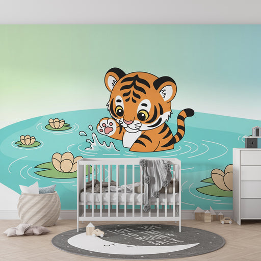 KidsWallPrzynieś do pokoju swojego dziecka zabawną i kolorową nutę za pomocą tego tapety dla dzieci, przedstawiającej uroczego małego tygrysa bawiącego się...
