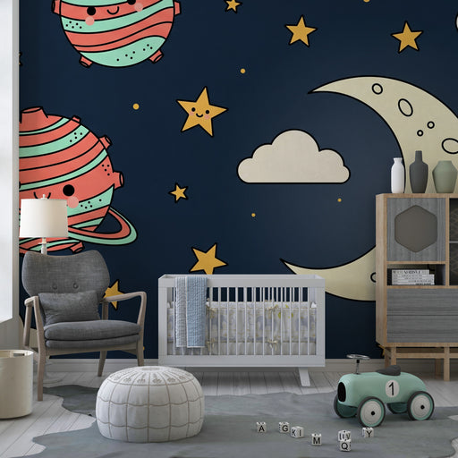 KidsWallZanurz się w czarującym świecie kosmosu z tą tapetą dla dzieci, przedstawiającą uśmiechnięte planety i gwiaździste niebo. Każdy szczegół, od błyszc...