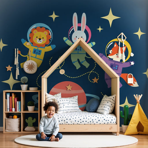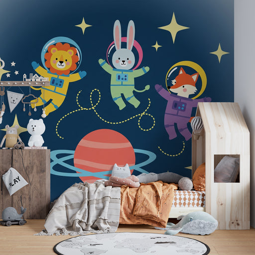 KidsWallWyrusz w kosmiczną przygodę w pokoju Twojego dziecka z tą tapetą dla dzieci. Trzy urocze zwierzęta - lew, królik i lis - beztrosko dryfują w kosmos...