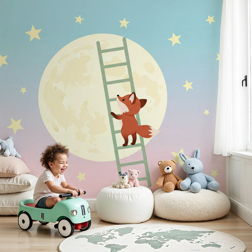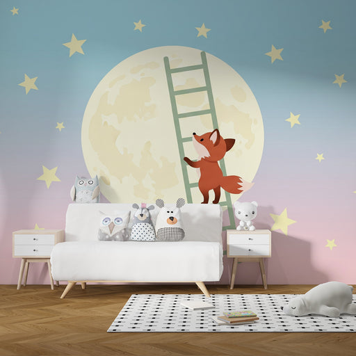 KidsWallWprowadź swoje dziecko w nocną podróż z tą tapetą dla dzieci przedstawiającą ciekawego lisa wspinającego się po drabinie do jasnego księżyca. Delik...