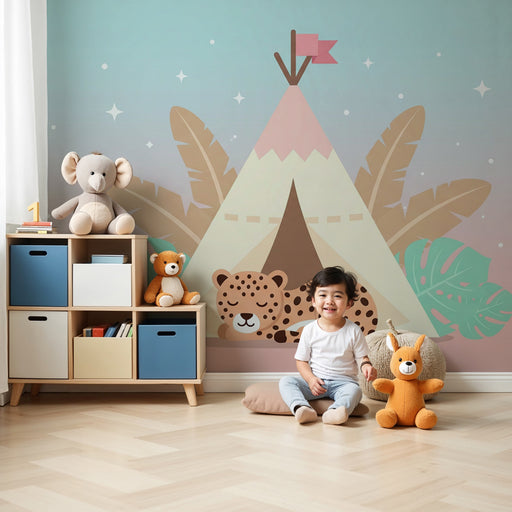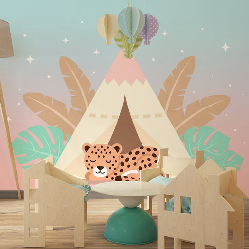 KidsWallPrzyozdób pokój swojego dziecka tym tapetą dla dzieci przedstawiającą uroczą namiot w tropikalnym otoczeniu. Spokojny mały lampart leży, dodając pr...