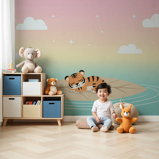 KidsWallPrzemień pokój swojego dziecka tym tapetą dla dzieci, która uchwyci delikatność i niewinność tygrysa spokojnie śpiącego na dużym liściu. Z najbardz...