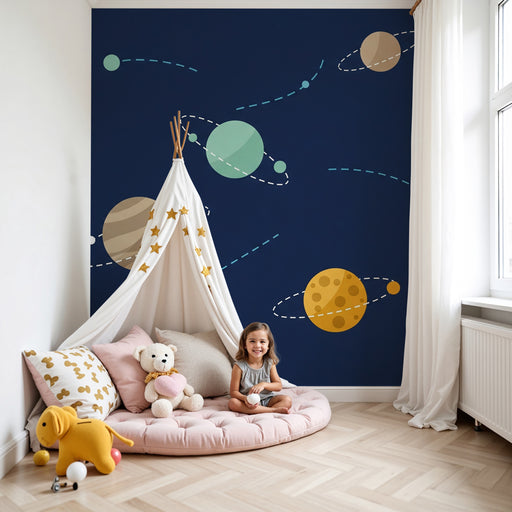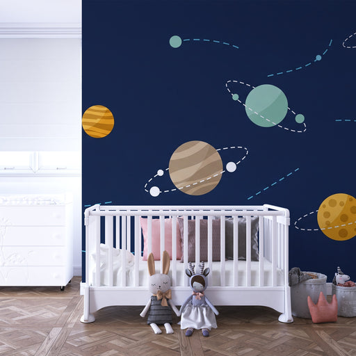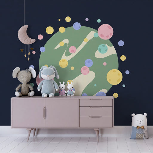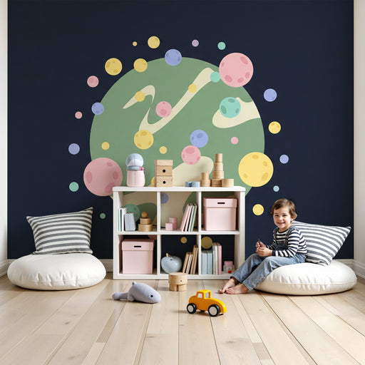 KidsWallPrzekształć pokój swojego dziecka w podróż międzygalaktyczną za pomocą tej tapety dla dzieci, gdzie kolorowe planety unoszą się w tajemniczym wszec...