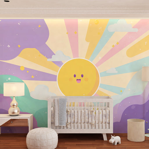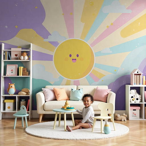 KidsWallPrzynieś radość do pokoju swojego dziecka naszym tapetą Słońce Radosne. Ten uroczy wzór przedstawia uśmiechnięte słońce otoczone chmurami i wieloba...