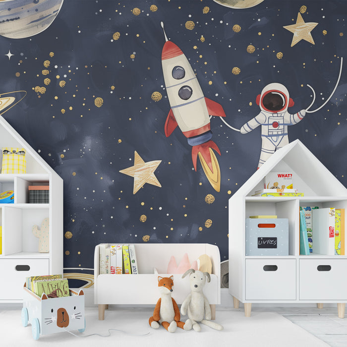 Tapety dla dzieci | Magiczna przestrzeń z astronautą i rakietą wśród gwiazd