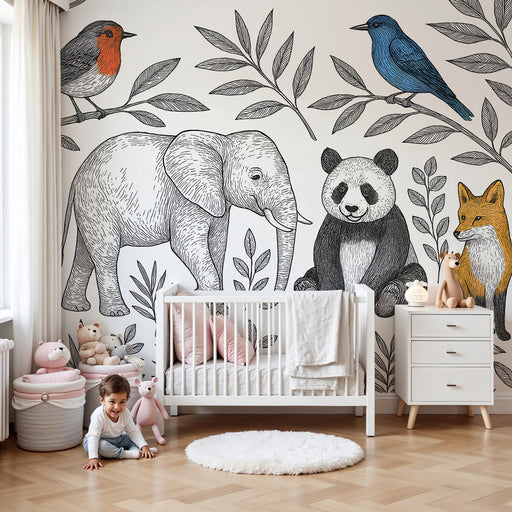 KidsWallWyrusz w dziką przygodę z tym tapetą dla dzieci, przedstawiającą urocze zwierzęta w sercu natury. Dobrotliwy słoń, wesoły panda, przebiegła lisica ...