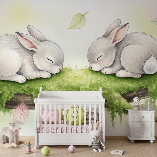 KidsWallUdekoruj pokój swojego dziecka tym tapetą dla dzieci przedstawiającą śpiące króliki, które przytulają się do gałęzi pokrytej mchem. Ten uspokajając...