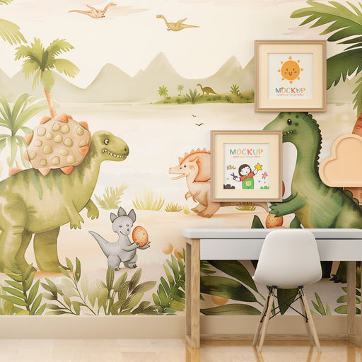 KidsWallZanurz swoje dziecko w fascynującym prehistorycznym świecie za pomocą tego tapety dla dzieci, na której radosne dinozaury bawią się wśród wybuchają...