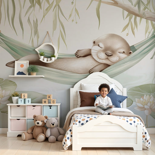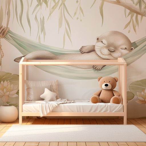 KidsWallPrzekształć pokój swojego dziecka w oazę spokoju dzięki naszym tapetom dla dzieci, przedstawiającym spokojnego wydrę, odpoczywającego w hamaku nad ...