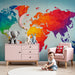 Odkryj naszą tapetę mapy świata o żywym i nowoczesnym geometrycznym wzornictwie. Każdy kontynent jest reprezentowany za pomocą kolorowych wzorów geometrycznych, od delikatnego niebieskiego po żywy czerwony, dodając energię i kreatywność do każdej przestrzeni.