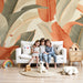 Przyozdób pokój swojego dziecka tym tapetą dla dzieci inspirowaną naturą. Prezentując obfitość tropikalnych liści w delikatnych odcieniach zieleni, pomarańczy i kremu, ten wzór przywołuje spokój i harmonię.
