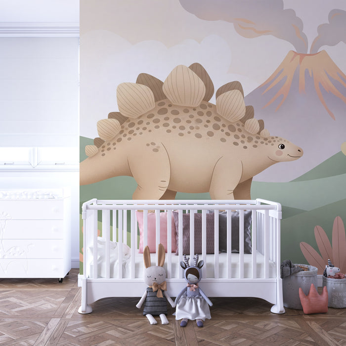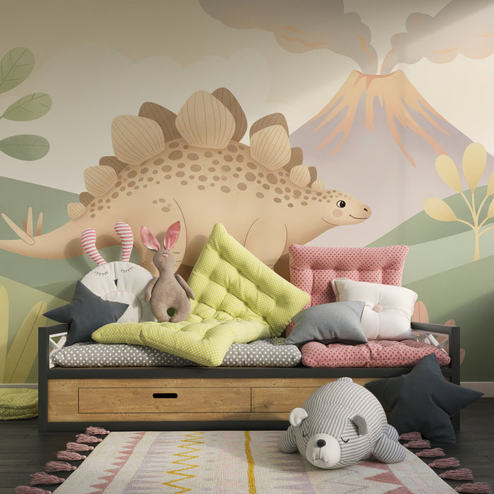 Przekształć pokój swojego dziecka w niezwykłą podróż do czasów dinozaurów dzięki tej uroczej tapetce dla dzieci. W centrum tej magicznej sceny stoi uroczy dinozaur w zielonym krajobrazie, obok dymiącego wulkanu. Ta fascynująca ilustracja rozbudzi wyobraźnię i zmysł przygody najmłodszych.