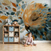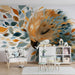 Zanurz swoje dziecko w świecie spokoju dzięki tej tapet dla dzieci, przedstawiającej uroczego ptaka otoczonego wirującymi kolorowymi liśćmi. Delikatne odcienie niebieskiego, pomarańczowego i kremowego tworzą kojącą atmosferę sprzyjającą snowi i marzeniom.