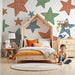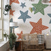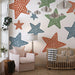 Każda gwiazda jest delikatnie ozdobiona białymi punktami, dodając zabawną i zabawną teksturę. Białe tło pozwala kolorom wybijać się, tworząc jasną i przytulną atmosferę. Ten design idealnie nadaje się do pokoju, w którym przygoda i kreatywność są na pierwszym miejscu.
