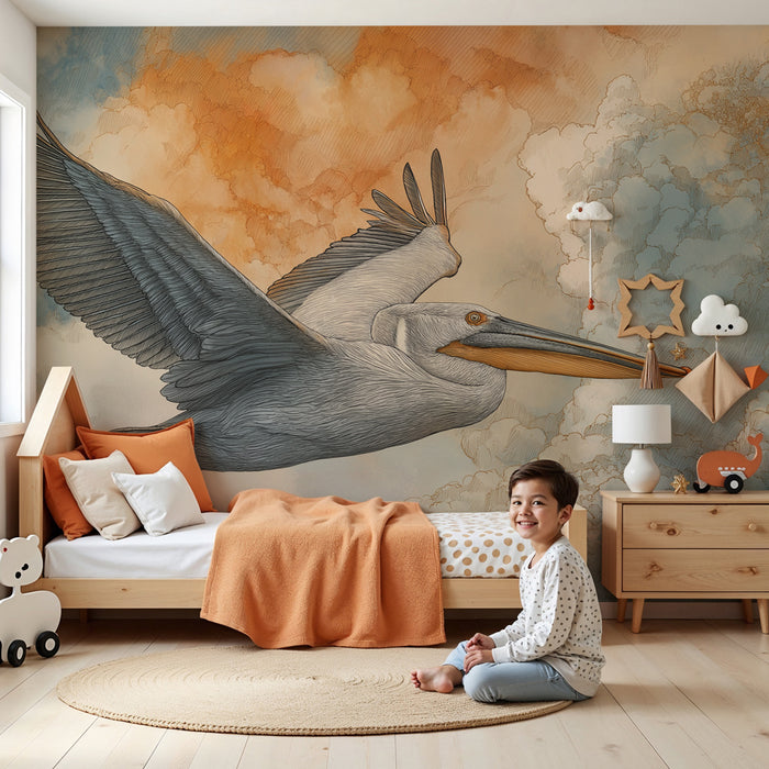 Embarquez pour une aventure apaisante dans la chambre de votre enfant avec ce papier peint pour enfants illustrant un pélican en plein vol. Les plumes détaillées et le long bec du pélican se détachent magnifiquement contre un ciel vibrant, mêlant des teintes douces d'orange et de bleu. Une œuvre qui non seulement embellit l'espace, mais inspire également l'imagination.
