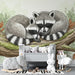 Les détails minutieux des feuilles verdoyantes et des feuilles d'automne ajoutent une touche de nature, tandis que le fond en eau-colorée apaisante joue avec des nuances douces de vert et de marron. Chaque élément, du pelage des ratons laveurs aux textures des branches, contribue à un effet visuel harmonieux et captivant.