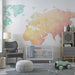 Ajoutez une touche artistique à votre espace avec notre papier peint géométrique monde. Ce design unique représente une carte du monde en utilisant des formes polygonales et un dégradé de couleurs pastel, allant du vert au bleu en passant par le rose et le jaune.