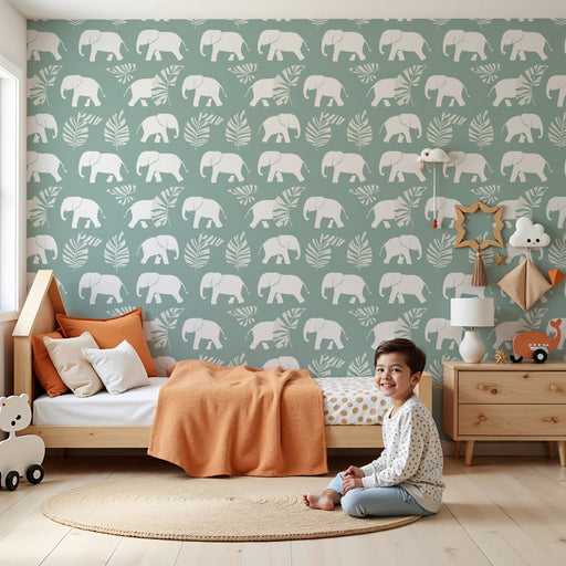 KidsWallTransforme o espaço do teu filho com este papel de parede para quarto de criança, onde elefantes encantadores e folhas exóticas dançam num padrão d...