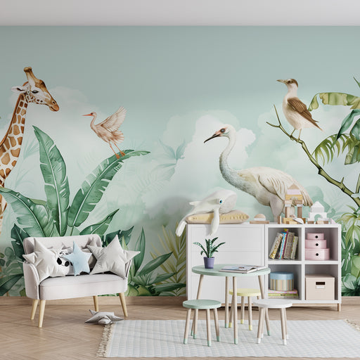 Mostrar todos os detalhesPapel de parede criança | Safari encantado com animais e folhagem tropical