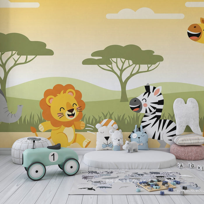 Transforme o quarto do seu filho numa verdadeira aventura com este papel de parede para criança ilustrando animais felizes da savana. Um leão travesso, um elefante sorridente, uma zebra brincalhona e uma girafa divertida reúnem-se em torno de uma bola nesta cena lúdica e colorida, perfeita para estimular a imaginação.
