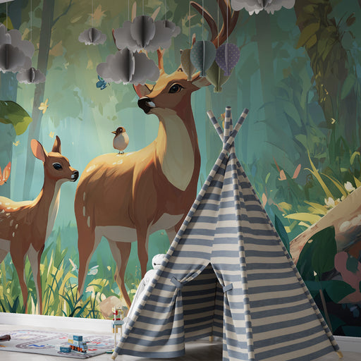 KidsWallDecore o seu espaço com o nosso papel de parede floresta encantada que representa veados majestosos rodeados por uma natureza encantadora. Mergulhe...