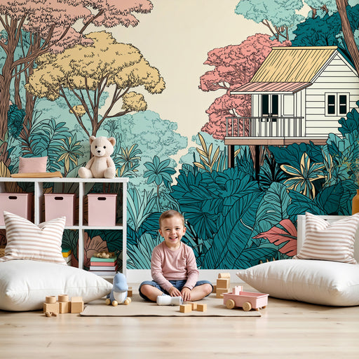 Mostrar todos os detalhesPapel de parede criança | Casa na selva colorida