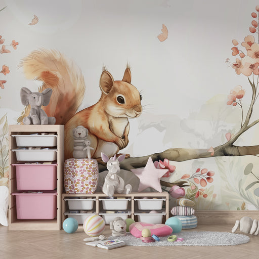 KidsWallOfereça ao seu quarto de bebê um toque mágico com o nosso papel de parede único que representa três bebês esquilos gulosos sentados num ramo florid...