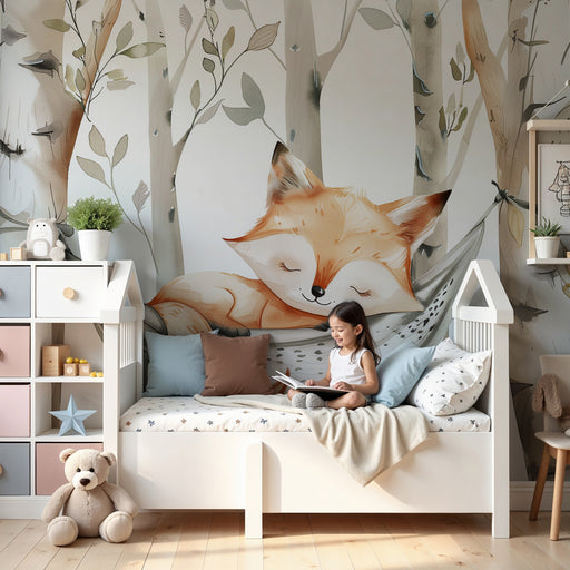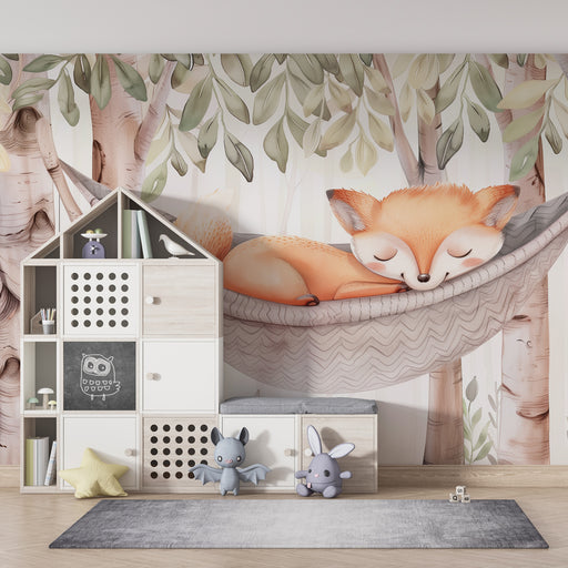 Mostrar todos os detalhesPapel de parede quarto bebê – Pequena raposa adormecida numa rede tricotada no coração de uma floresta de bétulas