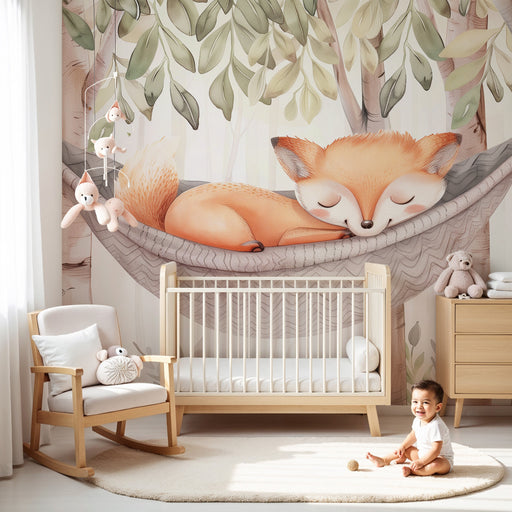 KidsWallSublimez o quarto do seu bebé com o nosso papel de parede único que representa um pequeno raposinho a dormir numa rede de tricô no coração de uma f...