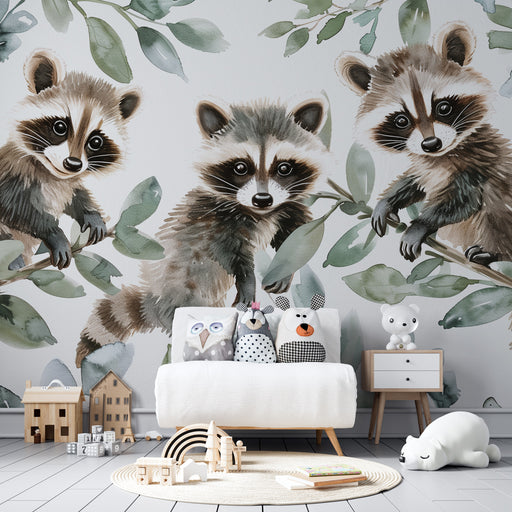 KidsWallOfereça ao seu quarto de bebé um toque de magia com o nosso papel de parede único, apresentando um trio de guaxinins brincalhões em ramos frondosos...