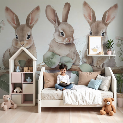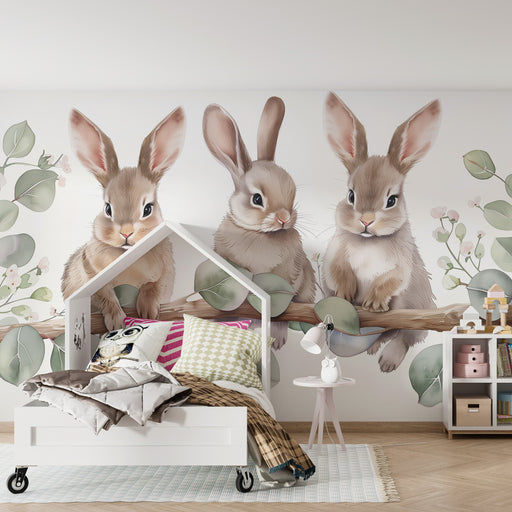 KidsWallTransforme o quarto do seu bebé num refúgio de paz com o nosso papel de parede quarto bebê representando três coelhinhos na sua rama, rodeados de f...