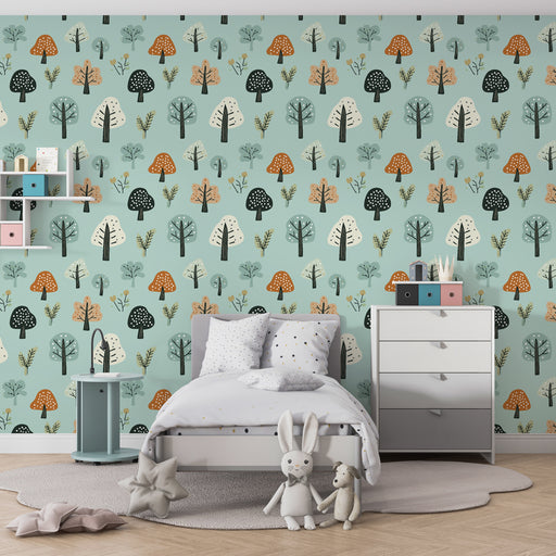 KidsWallTransforme o espaço do teu filho com este papel de parede para quarto de criança, evocando uma floresta mágica povoada por árvores e cogumelos colo...