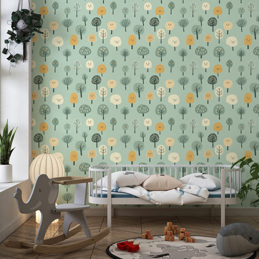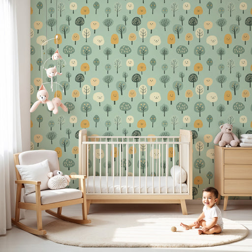Mostrar todos os detalhesPapel de parede criança com padrões | Floresta alegre com árvores sorridentes